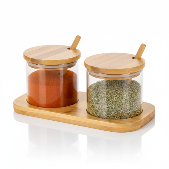2. JOGO 2 PORTA CONDIMENTO VIDRO + SUPORTE BAMBU