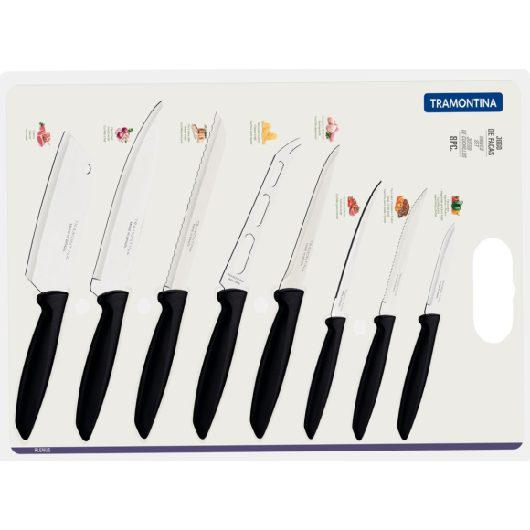 JOGO DE FACAS TRAMONTINA PLENUS COM LÂMINAS EM AÇO INOX E CABOS DE POLIPROPILENO PRETO 8 PEÇAS